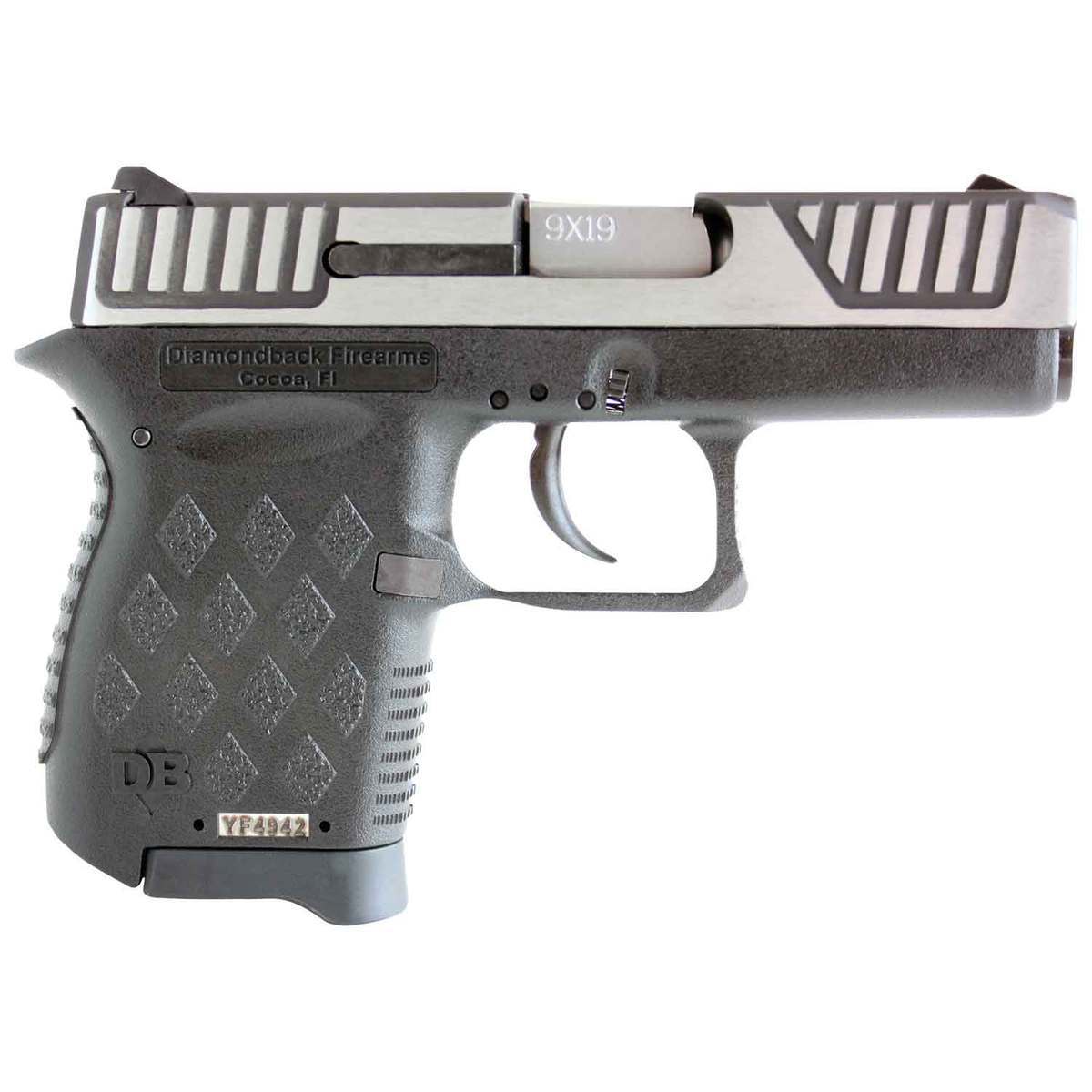 Diamondback DB9 9mm Luger 3in Stainless/Black Pistol – 6+1 Rounds -Diamondback Firearms is proud to present the DB9, a micro-compact 9mm pistol made entirely in the USA. Designed with safety in mind, the DB9 features a “,ZERO-Energy”, striker firing system with a mechanical firing pin block, a steel magazine catch to secure a sheet metal magazine and real windage-adjustable sights, all in a lightweight pistol. A steel trigger with dual connecting bars allows for a crisp, smooth, trigger pull. The DB9 features a FEA (Finite Element Analysis) designed slide and barrel that is stronger than any comparable firearm, resulting in durability with less felt recoil, and the absence of removable pins or tools makes field stripping easier than ever.
